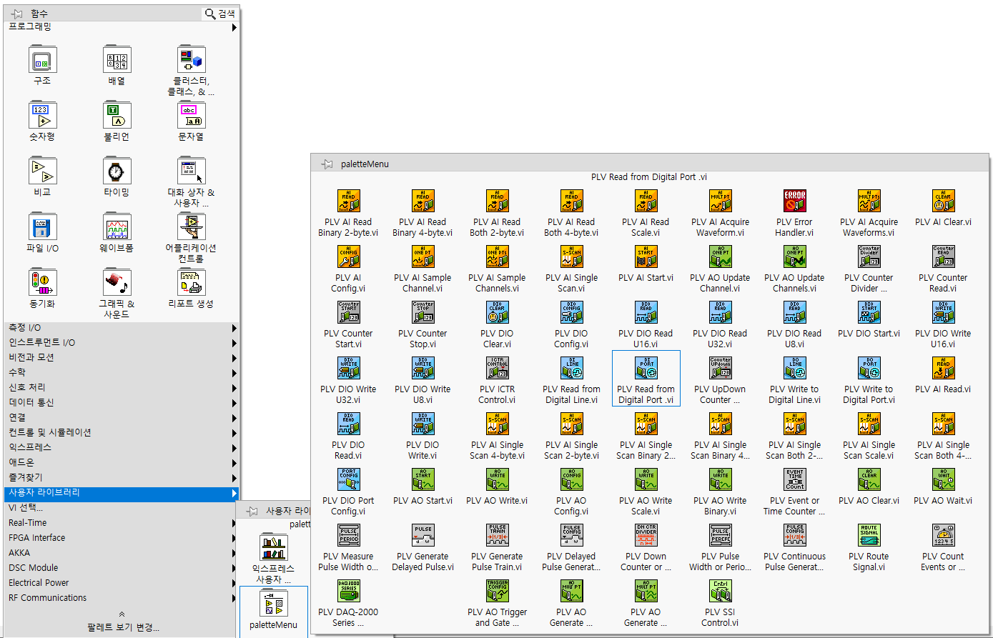 4. user.lib의 정상적으로 등록이 되면 랩뷰 함수에 ADLINK DAQ 함수를 확인 할 수 있습니다.