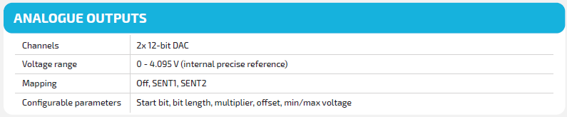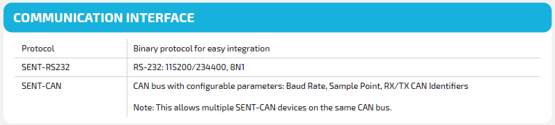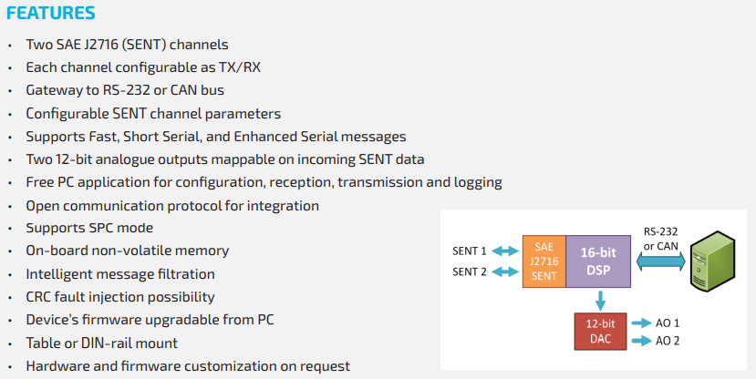 SAE J2716 (SENT) to RS-232/CAN bus Gateway/Interface offers two bi-directional SENT channels, two analogue channels, and either a RS-232 or CAN bus interface. Each SENT channel supports reception and transmission of SENT frames and all SENT communication p