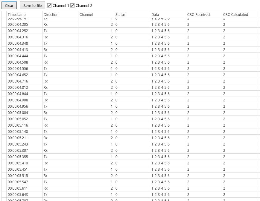 > 정상적으로 1번 채널에서 보내고 2번 채널에서 받는 화면입니다.